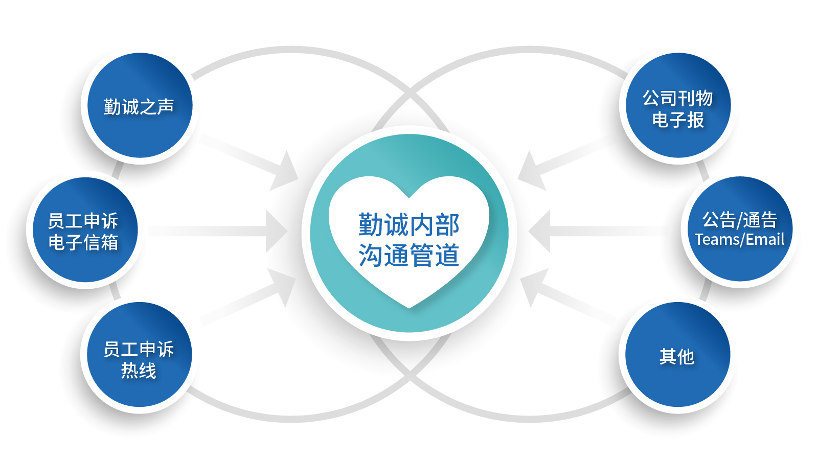勤诚设置「勤诚之声-员工意见回馈平台」、员工申诉热线与电子信箱、公司刊物-电子报、数位平台与电子公告/通告等多元平台,以绝对保密的机制,鼓励员工表达对公司的诉求,提供员工全善的双向沟通管道。每三个月定期召开职工代表大会,透过职工代表参与制定及审议通过公司职工奖惩办法、企业年终奖方案、福利费使用情况等,涉及职工切身利益的重要规章制度和重大事项。职工代表大会组织也会搜集同仁的建议,在大会中进行讨论,藉以增进劳资关系和谐、保障劳工权益。
