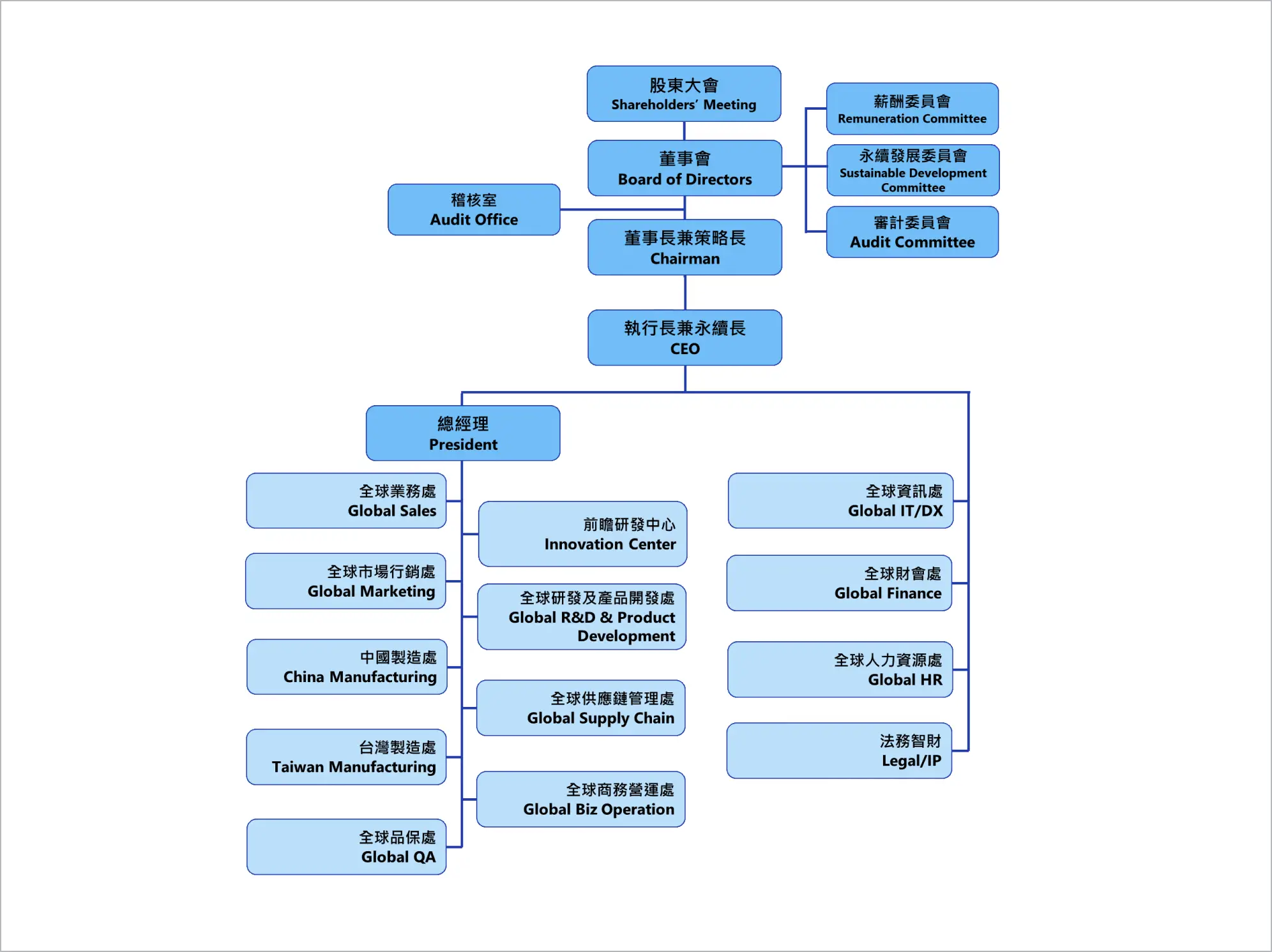 根据公司董事会决议,组织制订公司经营方针、经营目标、经营计划,及拟订执行计划。 投资人关係维繫。 拟订并推动实现ESG企业承诺。