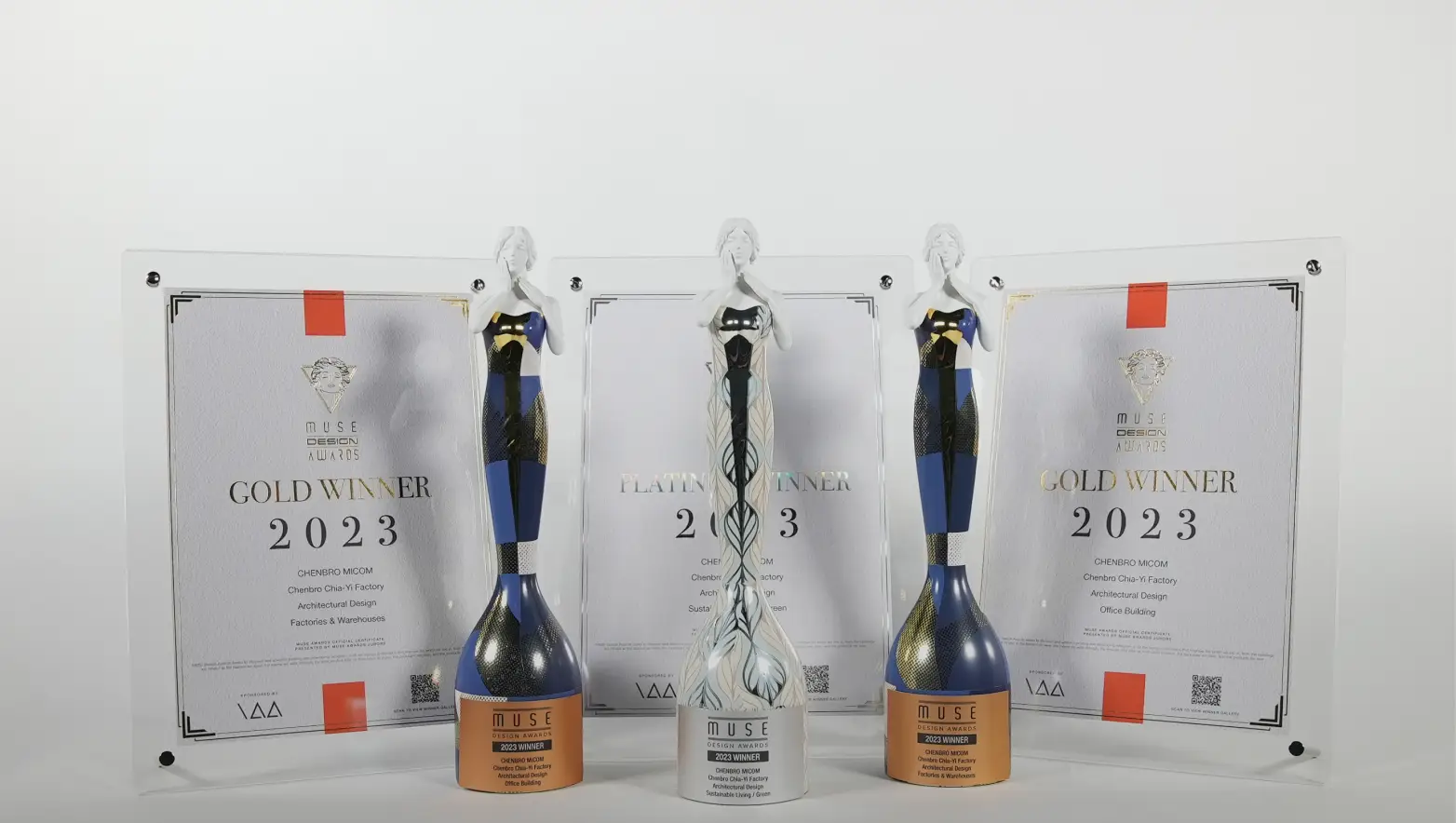 2023年榮獲美國繆思設計大獎-永續環境綠建築設計鉑金獎、廠房建築設計金獎、辦公建築設計金獎