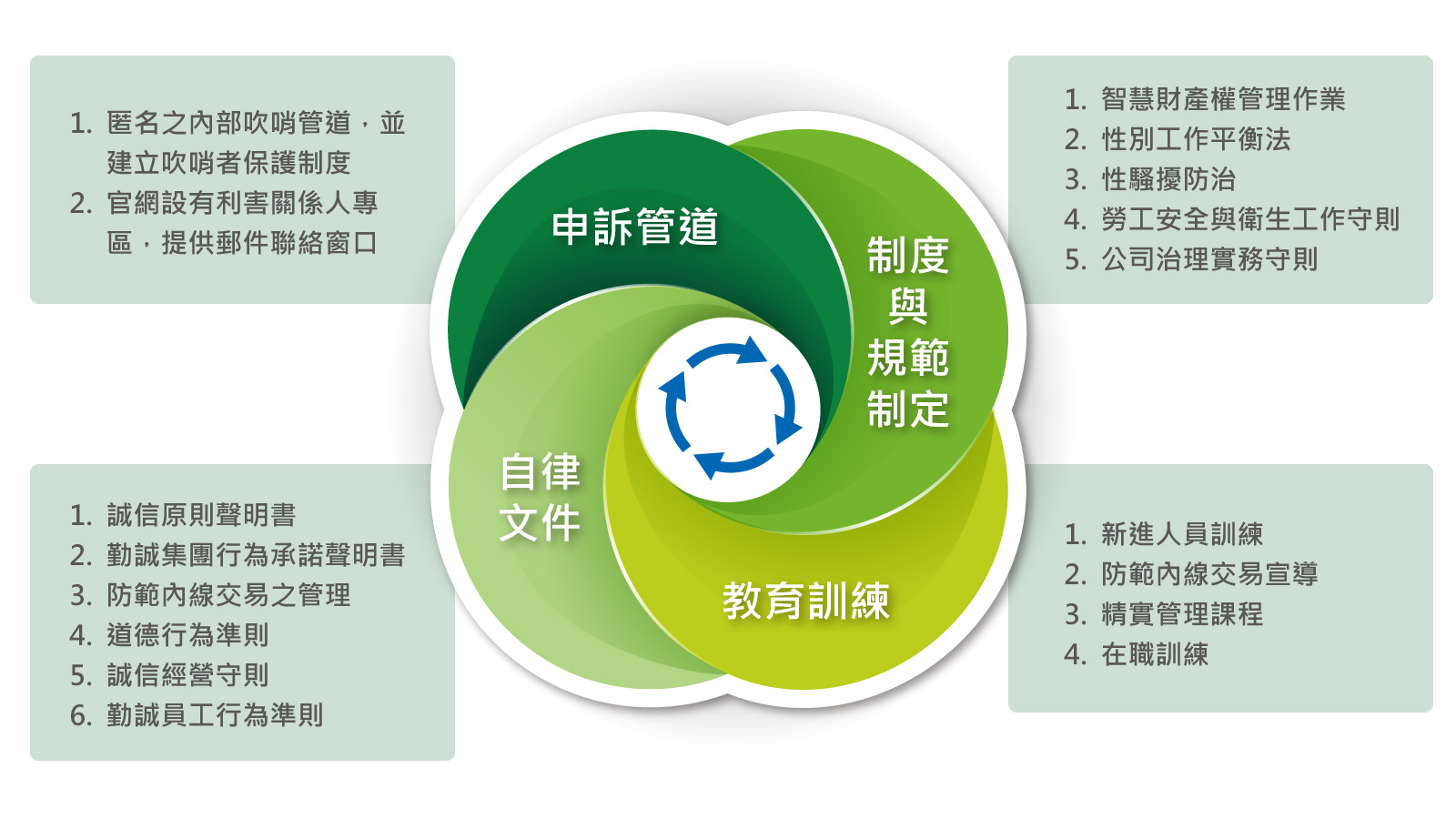 勤誠依據中華民國公司法、證券交易法及其他相關法規,訂定「公司治理實務守則」、「道德行為準則」、「誠信經營守則」及「永續發展實務守則」等,作為公司治理落實與執行之依據,致力完善公司治理架構,以強化董事會結構與職能、保障利害關係人權益及持續提升公司治理品質,以邁向公司永續發展。